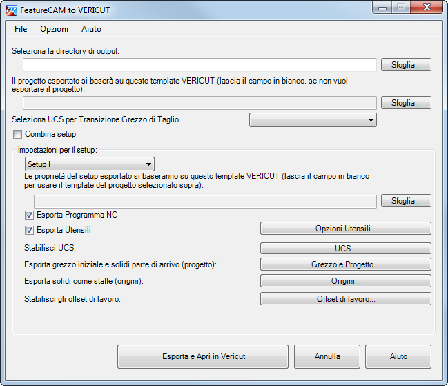 Exported setup properties will be based upon this VERICUT template (Le proprietà del setup esportato si baseranno su questo template VERICUT) — Per specificare un template Vericut distinto per ciascun setup, fare clic su Browse e selezionare il file del template da usare per il setup selezionato. Questo si può usare se si stanno utilizzando macchine diverse per ciascun setup. Questo non inciderà sulle impostazioni globali del progetto.