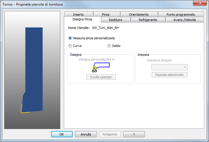 Selezionare una curva dall'elenco Seleziona disegno personalizzato, poi fare clic su Imposta selezionato per salvarla. La curva viene salvata nel database utensili indipendentemente dal file progetto. Qualsiasi uso successivo di questo utensile in qualsiasi file parte usa la pinza personalizzata.