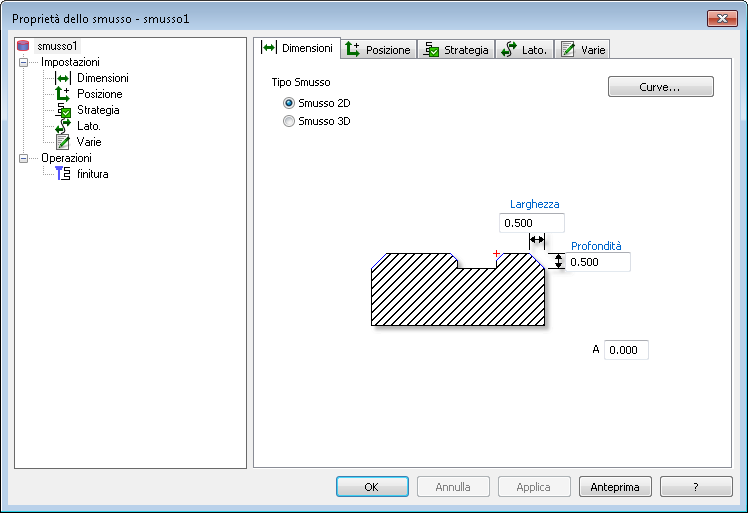 Inserire la Profondità dello smusso 3D, che è un offset utensile orizzontale e verticale (negativo) dal punto di contatto o la curva di input (il valore predefinito è 0,020" o 0,5 mm).