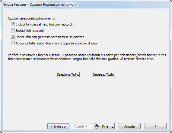 • Se si vuole tenere tutti i fori riconosciuti, fare clic su Seleziona tutto e fare clic su Fine.