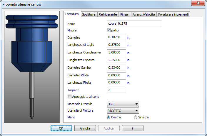 Materiale utensile — Indica il materiale dell'utensile. Questa informazione è importante quando si calcolano avanzamenti e velocità.