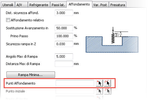 I punti di pre-foratura specificati da FeatureCAM sono sui bordi delle scanalature: