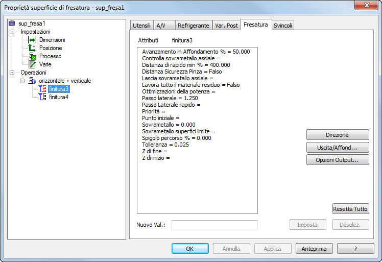 Sovrametallo finitura — Inserire la quantità di materiale da lasciare dopo una passata di finitura. Si può inserire un valore positivo o negativo. Si può inserire un numero negativo, fino al valore negativo del raggio dell'utensile, per permettere la riduzione del volume o lo spazio della scintilla, e la parte è lavorata in superfici, del valore negativo specificato. Se non viene impostato alcun valore, il Sovrametallo è come impostazione predefinita uguale a 0.