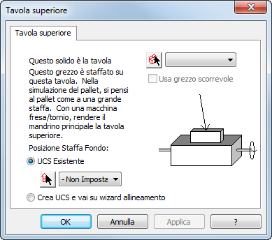 Il solido tavola superiore è il solido a cui sono attaccati grezzo e staffaggi. Ovvero, il grezzo e gli staffaggi nella simulazione macchina si muovono intorno con il solido che è specificato in questa finestra di dialogo come se fossero figli del solido.