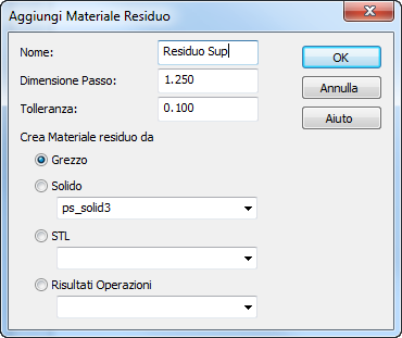 Per fare ciò, sulla scheda Grezzo per la seconda feature, selezionare Modello materiale residuo e selezionare il nome del modello materiale residuo e l'operazione che si vuole usare dall'elenco Operazioni: