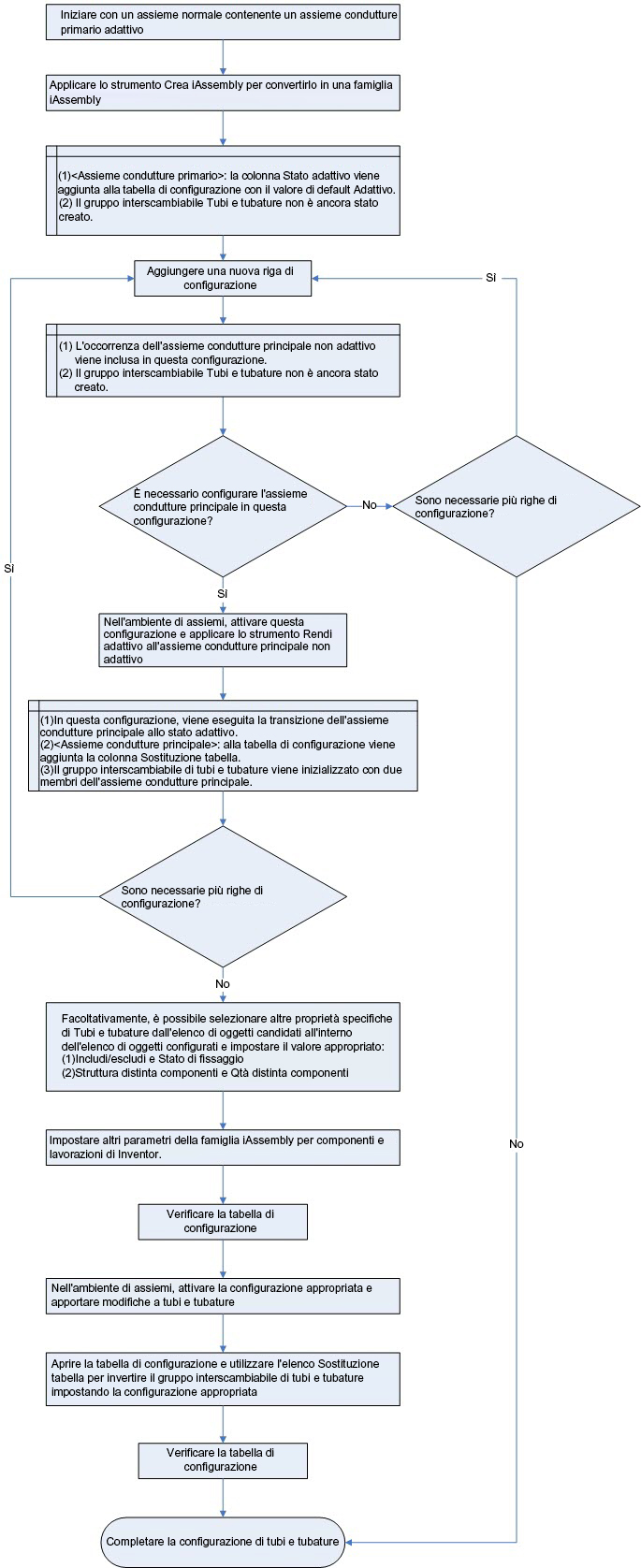 Il seguente diagramma di flusso illustra un flusso di lavoro generico di creazione di una famiglia di iAssembly di tubi e tubature e di modifica del suo set intercambiabile di tubi e tubature.