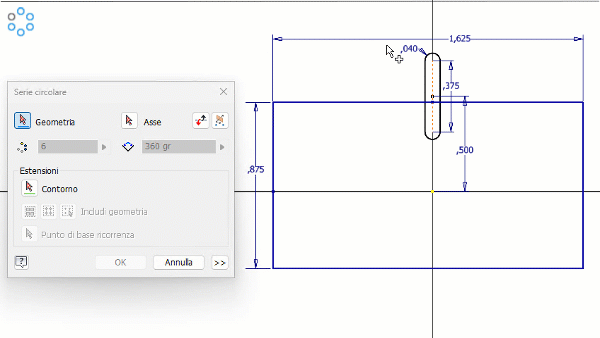È ora possibile utilizzare un contorno di schizzo e una geometria dello schizzo della serie solo all'interno di tale contorno. È possibile determinare quale geometria viene utilizzata nella serie, ad esempio solo all'interno del contorno, tutto con i centroidi all'interno del contorno o utilizzando un punto di base in cui viene utilizzata tutta la geometria con punti di base all'interno del contorno.
