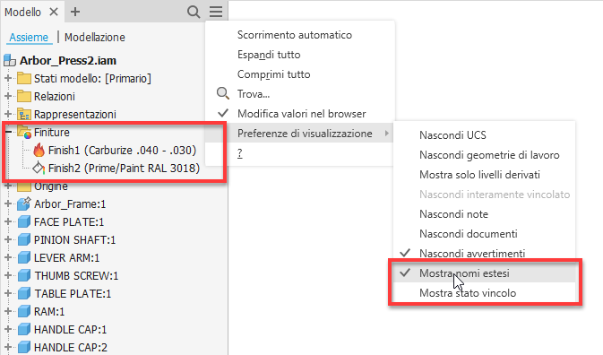 Utilizzare l'opzione Mostra nomi estesi nel menu a discesa Preferenze di visualizzazione del browser per visualizzare informazioni estese dopo il nome del nodo della lavorazione per i seguenti tipi di finitura:
