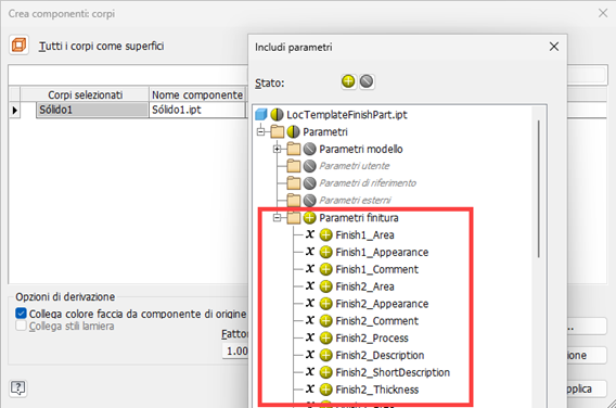 In Parti, Aspetti, Finiture e Parametri finitura ora possono essere derivati nel documento di destinazione quando si utilizza il comando Deriva o il comando Crea parte. Quando si include una finitura, tutti i parametri relativi verranno inclusi automaticamente. Al contrario, quando si esclude una finitura, tutti i parametri relativi verranno esclusi automaticamente. Tenere presente che non è possibile derivare le finiture soppresse.