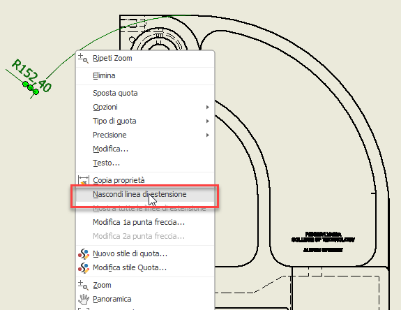 È stata aggiunta una nuova opzione per le quote Diametro e Raggio che consente di nascondere la linea di estensione. Per utilizzare questa funzione, selezionare la linea di estensione, fare clic con il pulsante destro del mouse e scegliere "Nascondi linea di estensione".