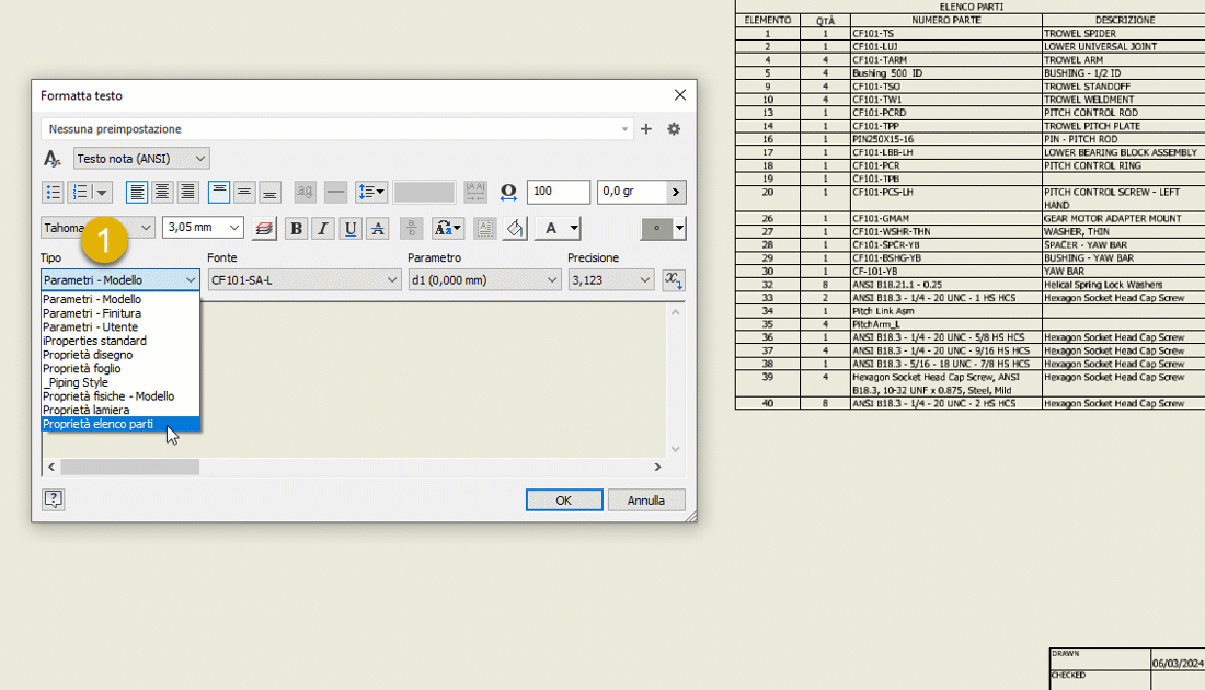 La possibilità di aggiungere proprietà dell'elenco parti a qualsiasi testo del disegno è stata aggiunta alla finestra di dialogo Testo.