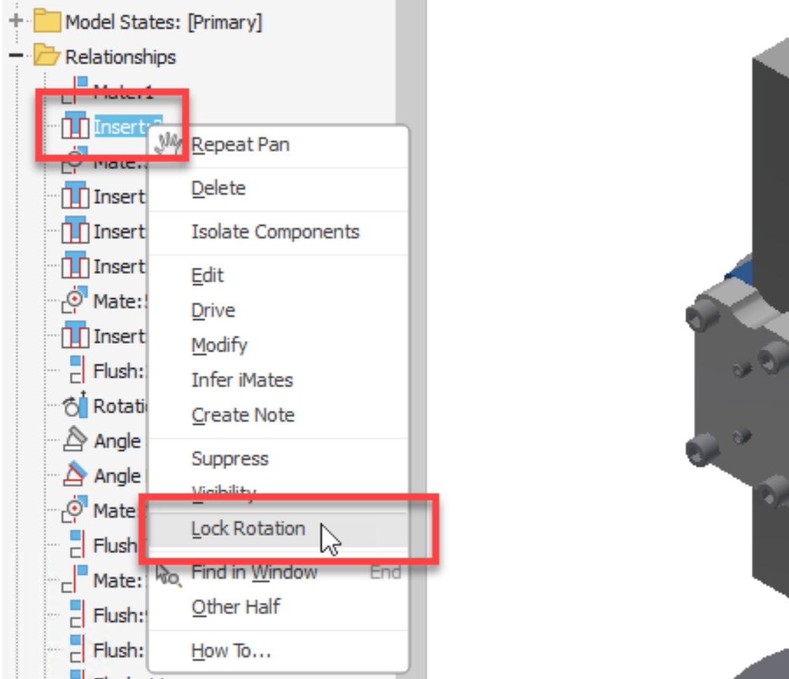In precedenza, per bloccare una posizione di vincolo, era necessario selezionare l'opzione "Blocca rotazione" nella finestra di dialogo. Ora, l'opzione "Blocca rotazione" è stata incorporata direttamente nel menu contestuale per il tipo di vincolo Inserimento. Questa opzione è disponibile anche quando sono selezionati più vincoli di inserimento.