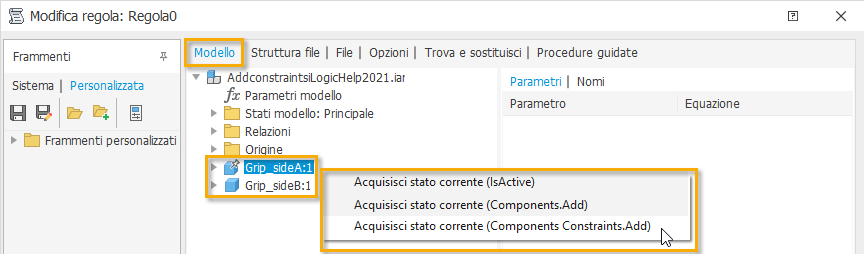 - Nel file di assiemi, nella finestra di dialogo Modifica regola nella scheda Modello, selezionare i nomi delle parti, fare clic con il pulsante destro del mouse, quindi selezionare Capture.Current.State (Components Constraints.Add) dal menu contestuale.