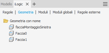 Il nome assegnato viene visualizzato nella scheda Geometria nel browser iLogic e sulla geometria nella finestra grafica (solo file di parti).