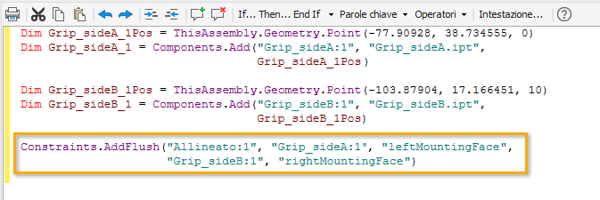 Assegnare innanzitutto un nome ad una faccia o uno spigolo, quindi creare una regola che aggiunge vincoli direttamente a facce o spigoli con tali nomi.