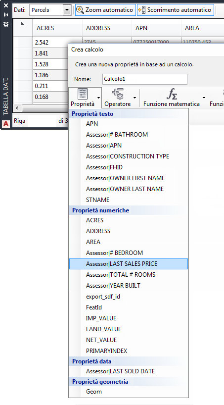 Sono state unite informazioni di un database di Microsoft Access ad un layer contenente particelle. Il layer è stato salvato in un nuovo file SDF esterno per renderne tutti i dati disponibili per un uso futuro. La nuova fonte dati è stata utilizzata per creare una proprietà calcolata.