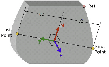 - Direzione perpendicolare: i valori di sollecitazione lungo la SCL sono riportati come sei tensori di sollecitazione in base a un sistema di coordinate locale. Pertanto è necessario definire le tre direzioni perpendicolari su cui sono basati i calcoli dei tensori. Questi assi vengono denominati T, N e H. L'asse T positivo è definito dalla direzione della SCL, dal primo punto all'ultimo punto. Il punto di riferimento definisce la direzione di Asse N o Asse H, a seconda di quale pulsante di opzione è stato attivato.