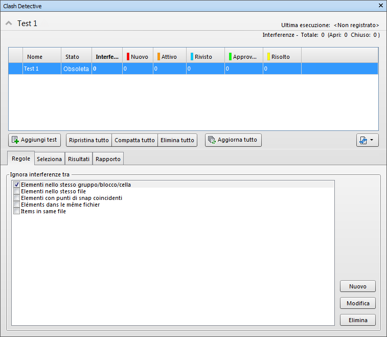 La finestra agganciabile Clash Detective consente di configurare le regole e le opzioni per test di interferenza, di visualizzare e ordinare i risultati e di generare rapporti sulle interferenze.