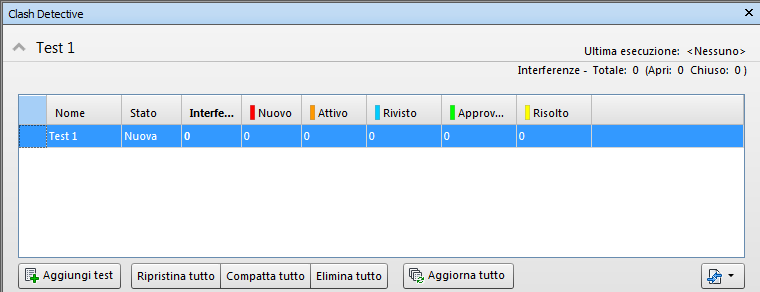 Il gruppo espandibile Test consente di gestire i test e i risultati di interferenze ed è visualizzabile da tutte le schede di Clash Detective facendo clic sul pulsante di espansione. In questo gruppo sono visualizzati tutti i test di interferenza attualmente impostati, elencati in formato tabella, e un riepilogo del relativo stato.