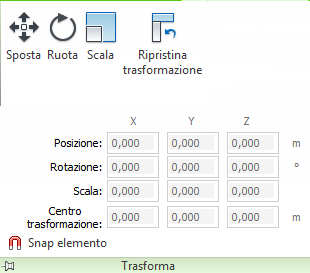 La scheda Strumenti sezione > gruppo Trasforma contiene strumenti che consentono di regolare la posizione e le dimensioni dei piani di sezione o il riquadro di sezionamento per circoscrivere la revisione a specifiche aree del modello. L'operazione può essere eseguita manualmente, mediante il gizmo Sposta, Ruota e Scala o mediante l'immissione di valori numerici nei campi forniti.