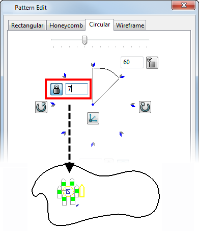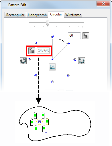 Imposta raggio del pattern - Il raggio del pattern è specificato come la distanza tra l'origine e l'oggetto originale. Non è possibile inserire un valore alternativo. Fare clic su