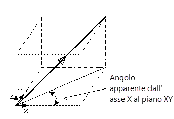 Angoli apparenti - L'angolo apparente è misurato tra la proiezione del vettore su un piano e l'asse selezionato. Se l'asse è X, il piano è XY. Per Y il piano è YZ e per Z è ZX. Qui di seguito è visualizzato un esempio dell'angolo apparente per l'asse X: