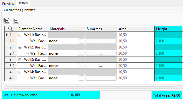 (Calculate Room Quantities) per aprire la finestra di dialogo Calculate Room Quantities. Selezionare un superficie del muro dalla struttura ad albero e trovare Wall Height Reduction in fondo alla finestra di dialogo.