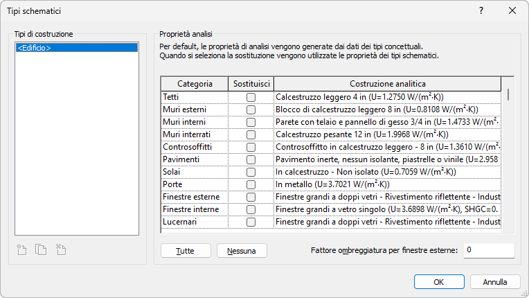 Alla successiva esecuzione di un'analisi energetica, per tali categorie di elementi vengono utilizzate le proprietà termiche per i tipi schematici specificati (costruzioni analitiche).