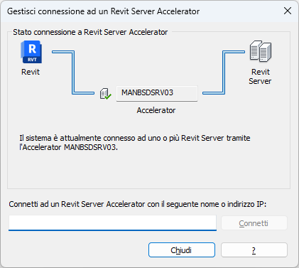 Utilizzare la seguente procedura per verificare lo stato della connessione all'Accelerator assegnato alla propria posizione (come specificato nella variabile di ambiente RSACCELERATOR2025 Release del sistema) e per specificare un altro Accelerator se necessario. Se si perde la connessione di rete ad un Revit Server Accelerator oppure si sceglie di non utilizzarlo, verrà stabilito un collegamento diretto ai Revit Server.