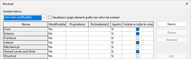Questa impostazione globale definisce il comportamento di default di ciascun workset nelle viste di progetto. È possibile modificare la visibilità di un workset in una o più viste specifiche.