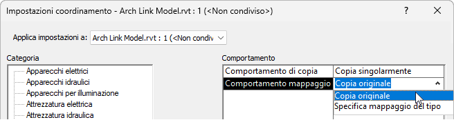 Per ogni tipo di impianto nella categoria, è possibile selezionare Copia tipo originale, Non copiare il tipo oppure un tipo di famiglia caricato nel modello. Tali mappaggi del tipo vengono utilizzati quando gli impianti vengono copiati nel modello.