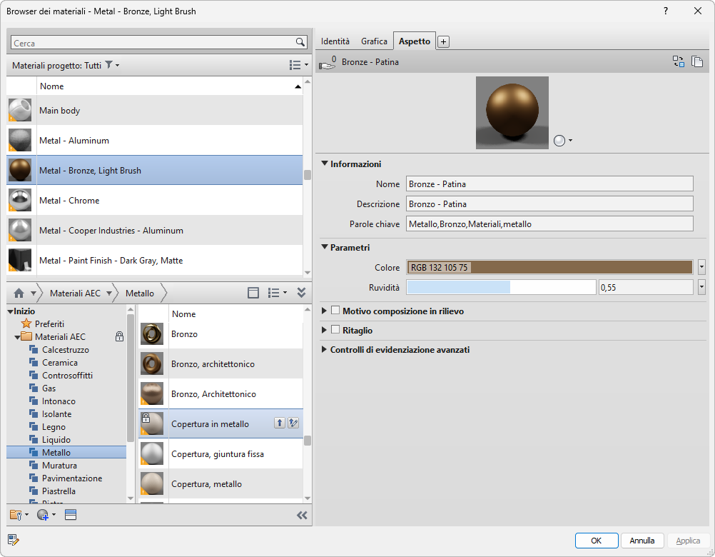 Nella figura seguente sono mostrate alcune proprietà dell'aspetto di un materiale selezionato visualizzato nel Browser dei materiali.