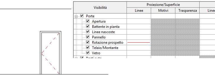 È possibile utilizzare le sottocategorie di uno stile di oggetti per controllare la visibilità e la grafica di porzioni di una famiglia all'interno di una categoria. Ad esempio, una sottocategoria controlla la visibilità di oscillazione di una porta in una vista di prospetto. Nell'immagine seguente, la sottocategoria Rotazione prospetto viene sostituita per utilizzare una linea rossa.