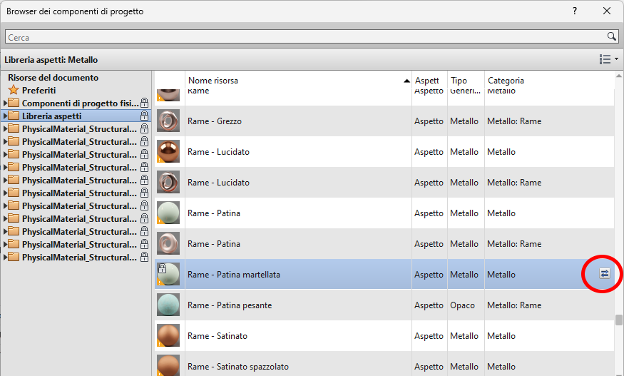 È possibile sostituire un componente esistente con un altro selezionato nel Browser dei componenti di progetto. Il materiale acquisisce le proprietà del nuovo componente di progetto.