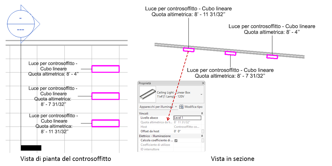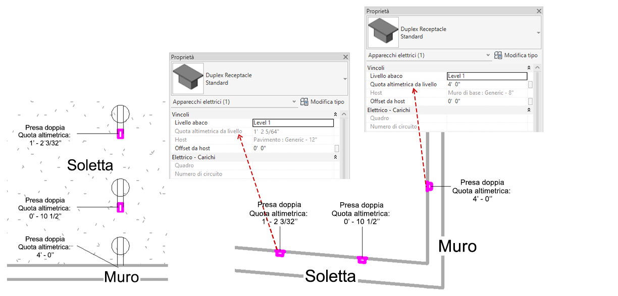 Il parametro Quota altimetrica da livello non è modificabile quando l'elemento viene posizionato su una superficie non verticale, ad esempio quando una presa viene posizionata su un pavimento o un dispositivo di illuminazione viene posizionato in un controsoffitto.