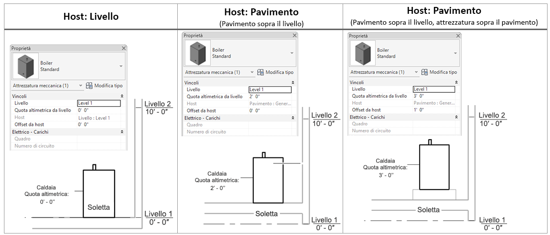 Nell'esempio riportato di seguito, il pavimento è 2' 0" sopra il livello. Quando la caldaia è posizionata sul pavimento, Quota altimetrica da livello = 2' 0" e Offset da host = 0' 0".