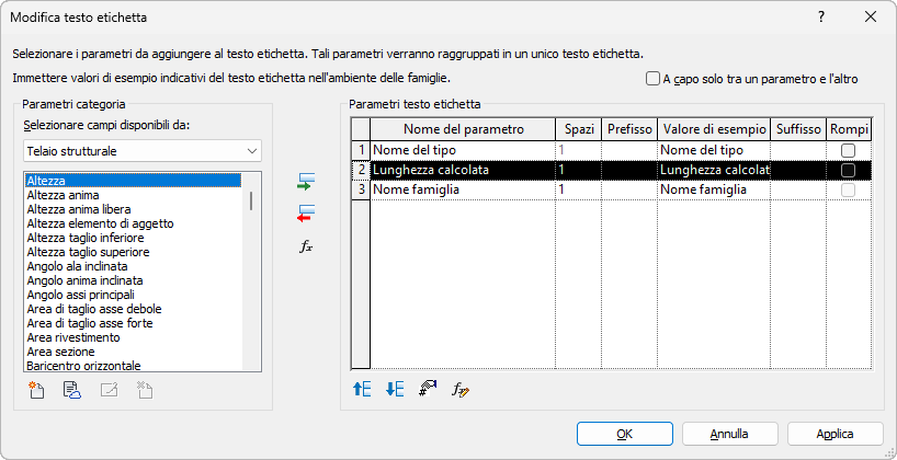 Nel riquadro Parametri categoria sono visualizzati i parametri del testo etichetta relativi al tipo di etichetta. Nel riquadro Parametri testo etichetta sono elencati i parametri di categoria visualizzati nel testo etichetta. Si tratta solitamente di un parametro singolo, ma è possibile creare testi etichetta concatenati molto più complessi e dettagliati.