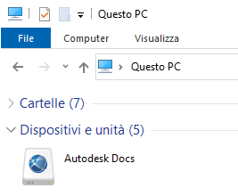 Dopo l'installazione di Desktop Connector, verrà visualizzata l'unità connessa di Autodesk Docs. Queste unità connesse possono essere utilizzate per collegare o aprire i tipi di file supportati all'interno di Revit.