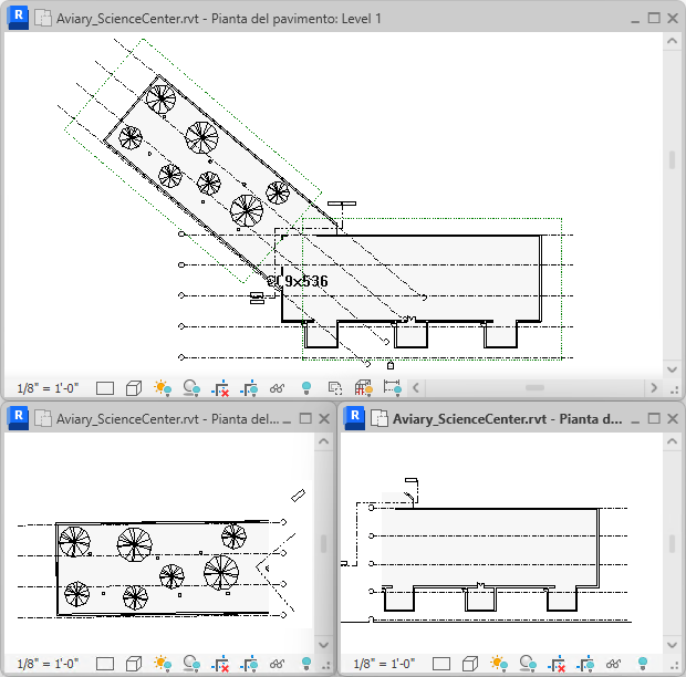 Nella parte superiore dell'illustrazione seguente vengono visualizzati i riquadri di definizione che circondano l'edificio principale e l'aviario. Il riquadro di definizione 1 è stato applicato alle linee di griglia dell'edificio principale, mentre il riquadro di definizione 2 è stato applicato alle linee di griglia dell'aviario. Di conseguenza, nelle viste dipendenti (parte inferiore dell'illustrazione) vengono visualizzate solo le linee di griglia appartenenti a ciascuna parte dell'edificio.