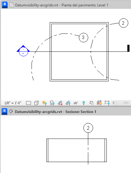 Le linee di griglia ad arco sono visualizzate nelle viste di sezione nel punto in cui il centro dell'arco interseca ed è perpendicolare alla linea di sezione.
