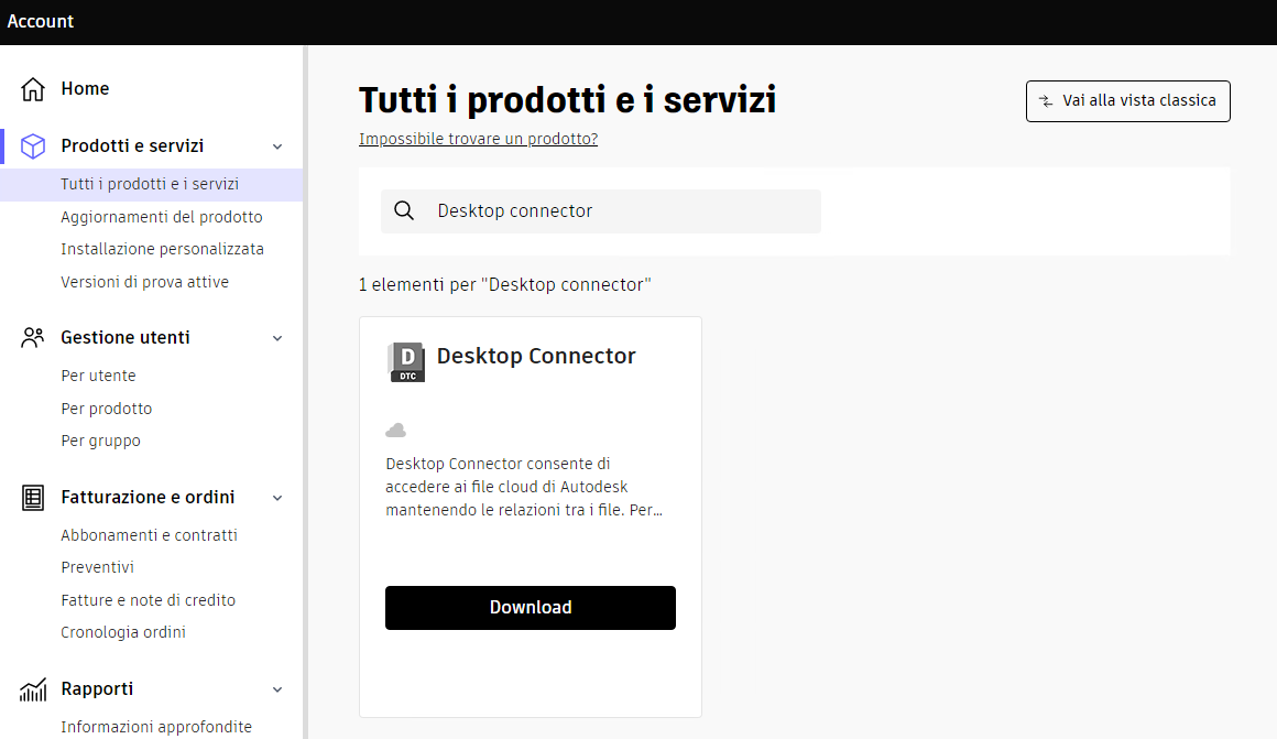 Per scaricare la versione più recente, visitare il sito Web all'indirizzo Autodesk Account - Prodotti e servizi. Desktop Connector viene visualizzato in Prodotti e servizi.