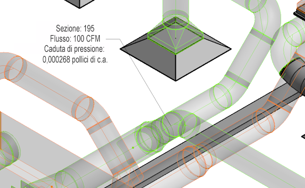 È possibile ispezionare e visualizzate i dati sulla caduta di pressione e sul flusso nelle reti di progettazione e fabbricazione. I segmenti analitici vengono visualizzati nell'interfaccia utente come elementi secondari. Questi segmenti possono essere selezionati, etichettati e inseriti in abachi.