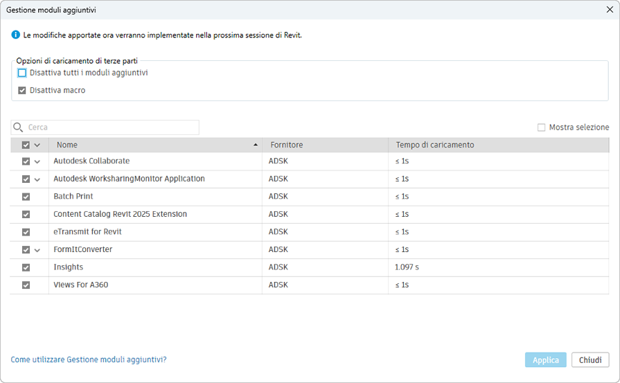 Gestione moduli aggiuntivi consente di attivare e disattivare i moduli aggiuntivi di Revit uno per uno o tutti insieme.