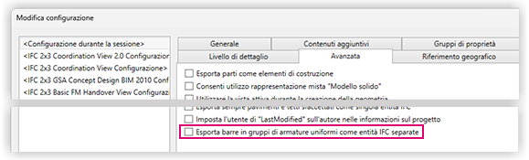 - Utilizzare l'opzione per esportare le barre in gruppi di armature uniformi come entità IFC separate: