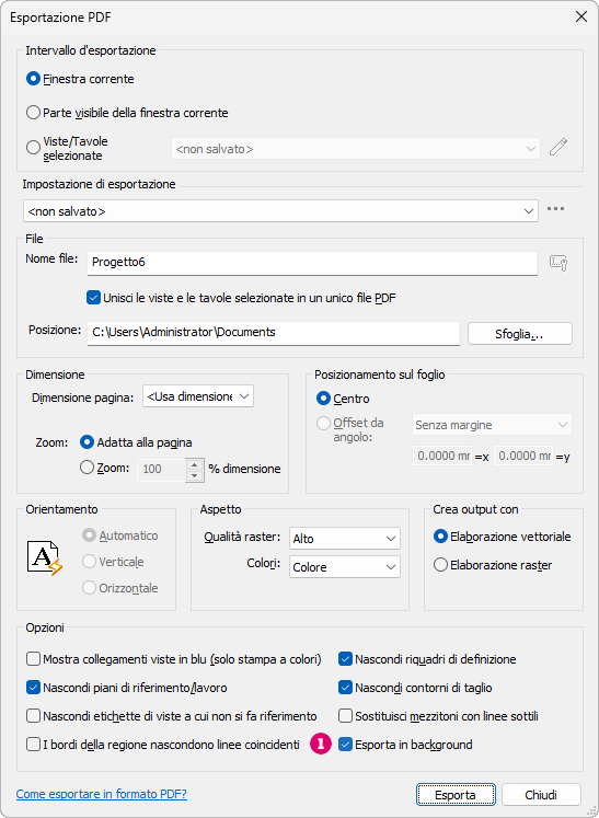 Per attivare la funzionalità Esporta in background, è sufficiente selezionare l'opzione corrispondente nella finestra di dialogo Esportazione PDF. In questo modo sarà possibile elaborare l'esportazione di file PDF in background mentre si continua a lavorare sul modello.