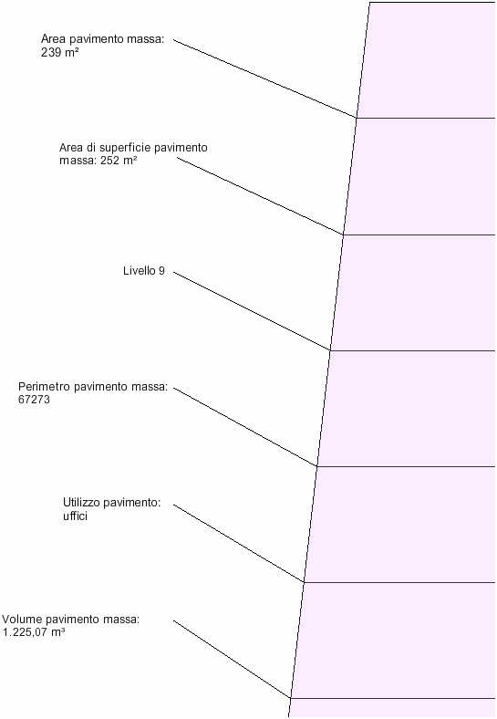 Nelle viste 2D è possibile assegnare etichette ai pavimenti di massa creati. Le etichette possono contenere informazioni su area, area della superficie esterna, perimetro, volume e utilizzo di ciascun pavimento di massa.
