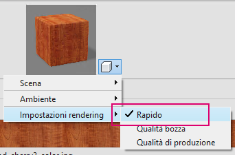 Quando si lavora nella scheda Aspetto del Browser dei materiali, utilizzare il menu a discesa accanto all'anteprima del materiale per configurare le impostazioni di rendering per l'immagine di anteprima. L'impostazione di rendering Rapido appena aggiunta consente di velocizzare la generazione dell'immagine di anteprima quando si modifica la selezione dei materiali.