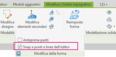 I miglioramenti apportati al funzionamento dello snap quando si lavora in modalità Modifica della forma consentono di ignorare i bordi e i punti interni e di utilizzare il valore Z degli elementi come punto di snap.