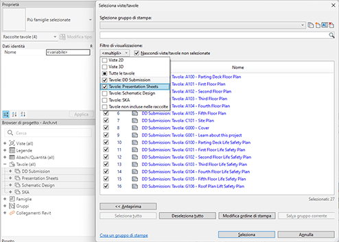 I parametri Raccolta di tavole e Raccolta di tavole di riferimento sono disponibili per tipi di vista compatibili presenti in Revit, insieme ai parametri di vista e tavola esistenti.