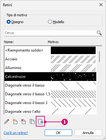 Nella finestra di dialogo Retini, a cui si accede dalla scheda Gestisci, selezionare uno o più motivi da esportare in un file PAT